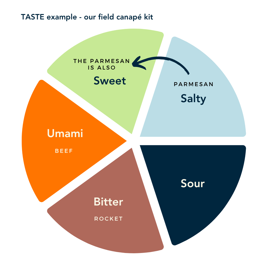 Try and ensure that each canapé includes at least three elements, to achieve that perfect balance. The graphic below demonstrates how our field canapé – a parmesan & nigella seed thin, topped with grass-fed beef bresaola and a fresh wild rocket and Sussex parmesan pesto – hits four out of the five notes.